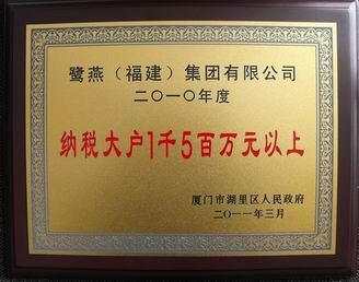 由廈門市湖里區政府舉辦的 “湖里區2010年度納稅先進企業”的評選名單已經正式揭曉,鷺燕(福建)集團有限公司榜上有名,獲得了 “湖里區2010年度納稅大戶1千5百萬元以上先進企業”的榮譽稱號。自2007年底搬遷至湖里區以來,我司已連續三年獲此榮譽稱號。