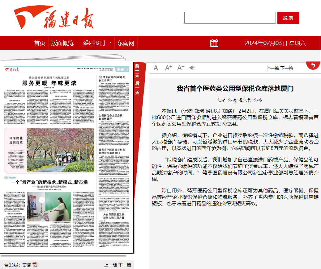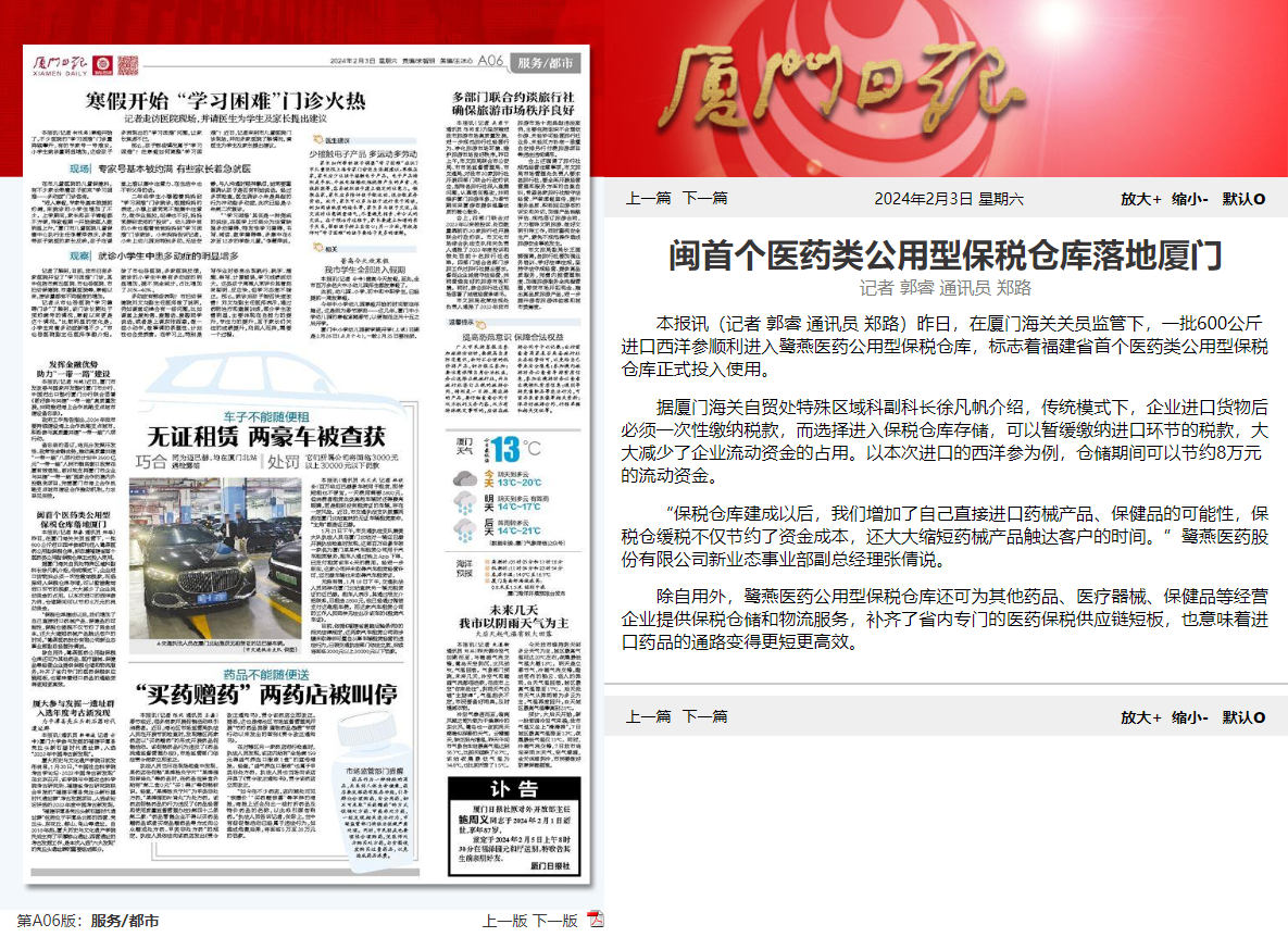 2024年2月2日,鷺燕醫(yī)藥公用型保稅倉(cāng)獲批投用,《福建日?qǐng)?bào)》《廈門日?qǐng)?bào)》相繼報(bào)道相關(guān)新聞。鷺燕醫(yī)藥公用型保稅倉(cāng)是福建省首個(gè)醫(yī)藥類公用型保稅倉(cāng)庫(kù),該保稅倉(cāng)庫(kù)的投用,意味著廈門市乃至福建省補(bǔ)齊了區(qū)域內(nèi)專門的醫(yī)藥保稅供應(yīng)鏈物流服務(wù),也意味著廈門和福建進(jìn)口藥品的通路變得更短,更為高效。